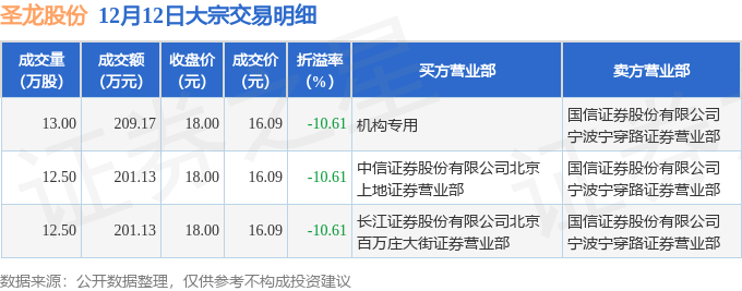 证券之星消息,12月12日圣龙股份发生大宗交易,交易数据如下: