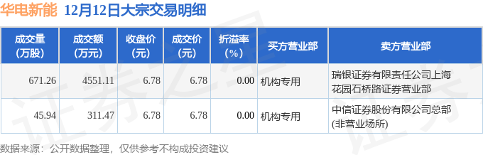 证券之星消息,12月12日华电新能发生大宗交易,交易数据如下: