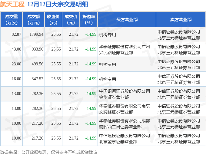 证券之星消息,12月12日航天工程发生大宗交易,交易数据如下: