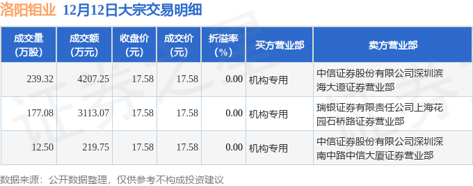 证券之星消息,12月12日洛阳钼业发生大宗交易,交易数据如下: