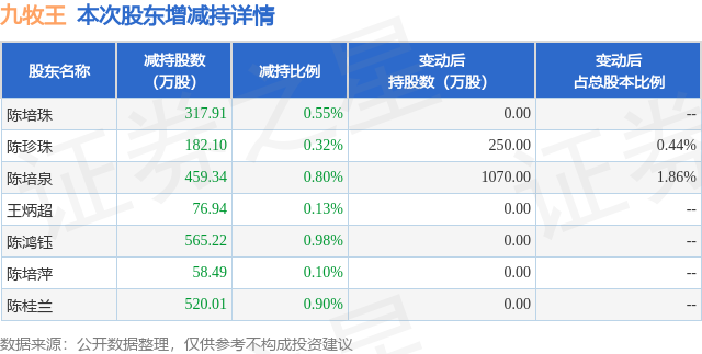 证券之星消息,12月12日九牧王发布公告《九牧王:九牧王关于持股5%以上的股东权益变动触及1%刻度的提示性公告(三)》,其股东陈培珠、陈珍珠、陈培泉、王炳超、陈鸿钰、陈培萍、陈桂兰于2025年12月11日至2025年12月12日间合计减持2180.01万股,占公司目前总股本的3.7937%,变动期间该股股价上涨4.3%,截止12月12日收盘报15.03元。