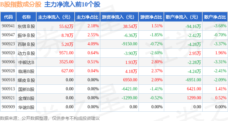 资金流向方面,B股指数(000003)成份股当日主力资金净流出合计8.33万元,游资资金净流入合计47.75万元,散户资金净流出合计39.42万元。成份股资金流向详情见下表: