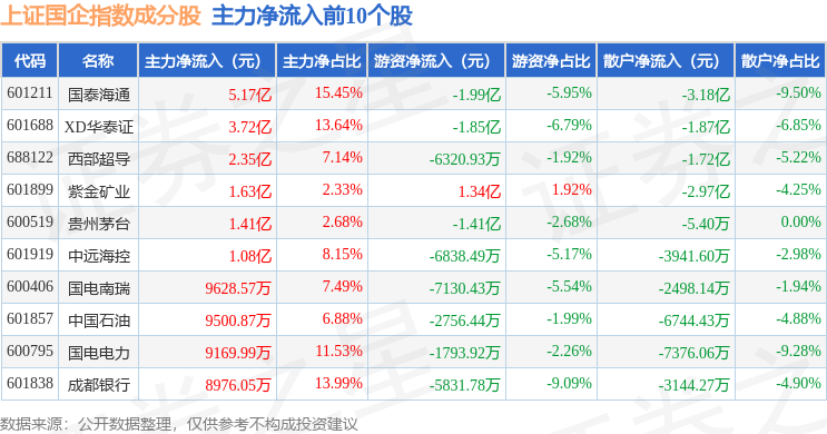 资金流向方面,上证国企(000056)指数成份股当日主力资金净流出合计10.02亿元,游资资金净流出合计4.34亿元,散户资金净流入合计14.35亿元。成份股资金流向详情见下表: