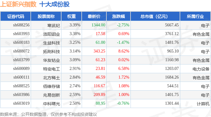 证券之星消息,12月12日,上证新兴(000067)指数报收于8733.76点,涨1.36%,成交1302.97亿元,换手率1.29%。当日该指数成份股中,上涨的有37家,拓荆科技以8.62%的涨幅领涨,下跌的有12家,寒武纪以2.75%的跌幅领跌。