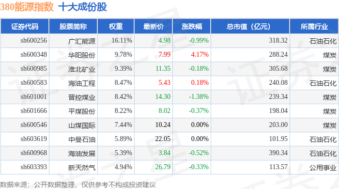 证券之星消息,12月12日,380能源(000104)指数报收于1271.66点,跌0.12%,成交33.88亿元,换手率1.1%。当日该指数成份股中,上涨的有3家,华阳股份以4.17%的涨幅领涨,下跌的有9家,苏能股份以2.35%的跌幅领跌。