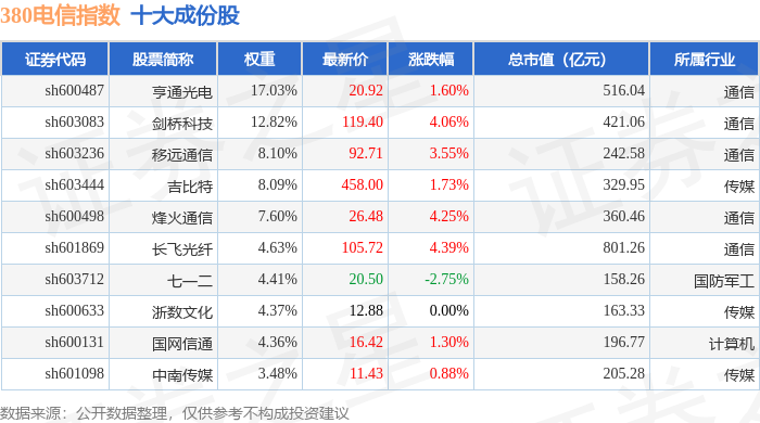 380电信(000112)指数十大成份股详情如下: