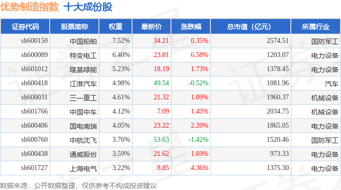 证券之星消息,12月12日,优势制造(000146)指数报收于7641.72点,涨1.84%,成交676.53亿元,换手率2.03%。当日该指数成份股中,上涨的有40家,中国西电以10.06%的涨幅领涨,下跌的有9家,中航沈飞以1.42%的跌幅领跌。