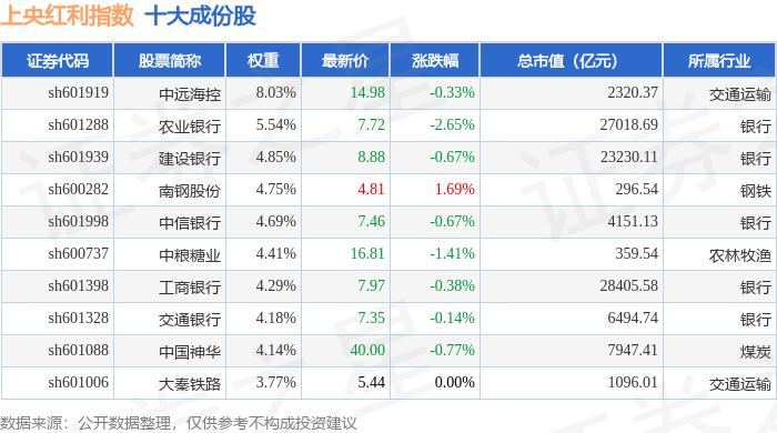 证券之星消息,12月12日,上央红利(000152)指数报收于2829.01点,跌0.58%,成交337.48亿元,换手率0.28%。当日该指数成份股中,上涨的有6家,南钢股份以1.69%的涨幅领涨,下跌的有21家,农业银行以2.65%的跌幅领跌。