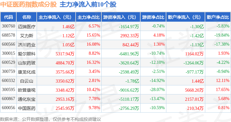 资金流向方面,中证医药(000933)指数成份股当日主力资金净流出合计10.52亿元,游资资金净流入合计2.0亿元,散户资金净流入合计8.53亿元。成份股资金流向详情见下表: