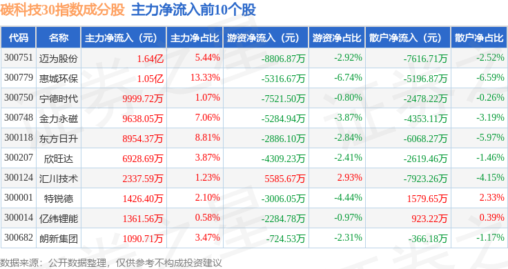 资金流向方面,碳科技30(399030)指数成份股当日主力资金净流出合计23.66亿元,游资资金净流入合计1.68亿元,散户资金净流入合计21.99亿元。成份股资金流向详情见下表: