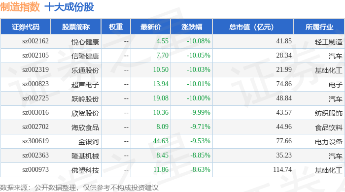 证券之星消息,12月12日,制造指数(399233)报收于3414.18点,涨0.76%,成交9108.52亿元,换手率3.33%。当日该指数成份股中,上涨的有963家,中能电气以20.04%的涨幅领涨,下跌的有928家,悦心健康以10.08%的跌幅领跌。