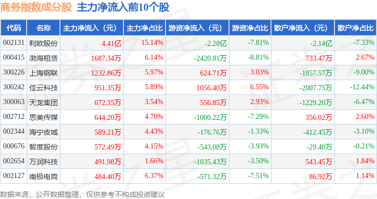 资金流向方面,商务指数(399242)成份股当日主力资金净流出合计1.05亿元,游资资金净流出合计1.72亿元,散户资金净流入合计2.77亿元。成份股资金流向详情见下表: