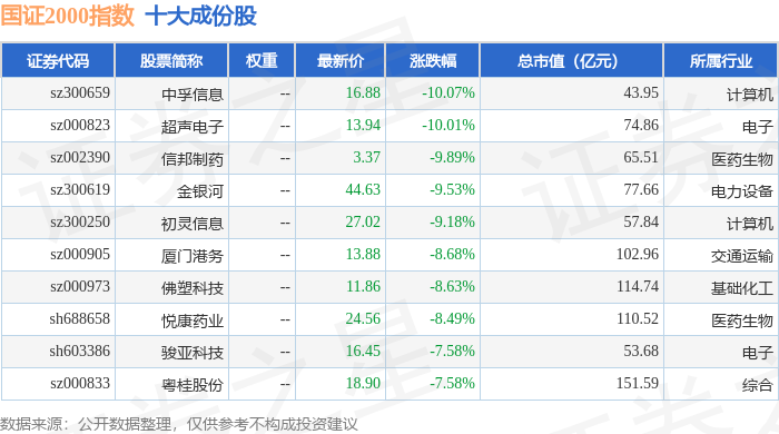 证券之星消息,12月12日,国证2000(399303)指数报收于9658.32点,涨0.91%,成交6509.61亿元,换手率3.16%。当日该指数成份股中,上涨的有1059家,中能电气以20.04%的涨幅领涨,下跌的有880家,中孚信息以10.07%的跌幅领跌。