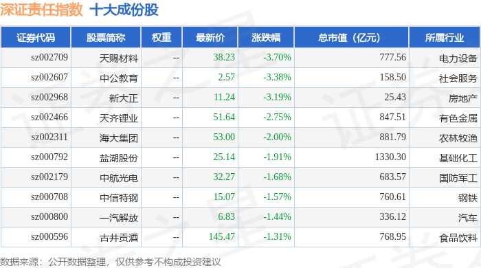 证券之星消息,12月12日,深证责任(399341)指数报收于1641.93点,涨0.73%,成交1061.98亿元,换手率1.48%。当日该指数成份股中,上涨的有65家,新乳业以5.1%的涨幅领涨,下跌的有32家,天赐材料以3.7%的跌幅领跌。