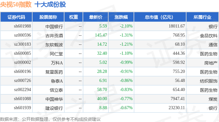 证券之星消息,12月12日,央视50(399550)指数报收于7943.35点,涨0.52%,成交670.97亿元,换手率0.45%。当日该指数成份股中,上涨的有30家,中天科技以3.75%的涨幅领涨,下跌的有17家,中国银行以2.1%的跌幅领跌。