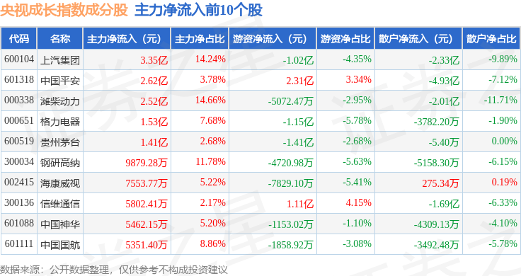 资金流向方面,央视成长(399552)指数成份股当日主力资金净流入合计8.79亿元,游资资金净流出合计2.61亿元,散户资金净流出合计6.18亿元。成份股资金流向详情见下表: