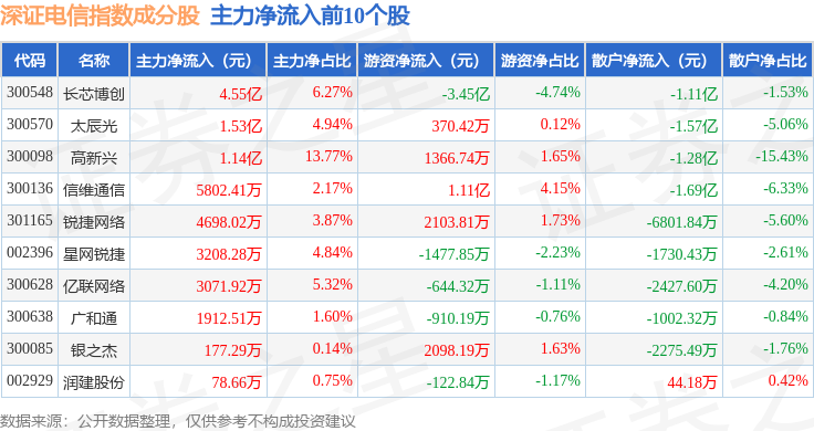 资金流向方面,深证电信(399621)指数成份股当日主力资金净流出合计19.51亿元,游资资金净流入合计10.69亿元,散户资金净流入合计8.82亿元。成份股资金流向详情见下表: