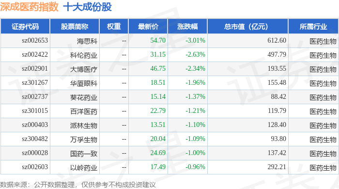 深成医药(399685)指数十大成份股详情如下: