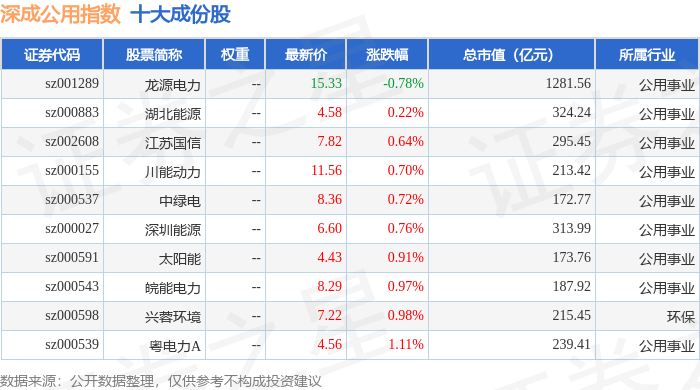 深成公用(399689)指数十大成份股详情如下: