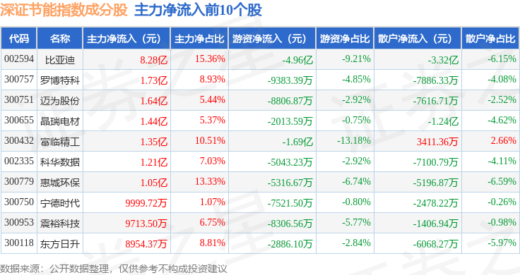 资金流向方面,深证节能(399695)指数成份股当日主力资金净流出合计37.17亿元,游资资金净流出合计7.74亿元,散户资金净流入合计44.91亿元。成份股资金流向详情见下表: