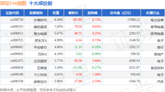 证券之星消息,12月12日,深证F60(399701)指数报收于7915.89点,涨0.62%,成交913.06亿元,换手率1.09%。当日该指数成份股中,上涨的有40家,立讯精密以3.66%的涨幅领涨,下跌的有19家,天齐锂业以2.75%的跌幅领跌。
