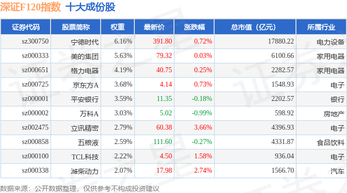 证券之星消息,12月12日,深证F120(399702)指数报收于7462.89点,涨0.59%,成交1613.08亿元,换手率1.24%。当日该指数成份股中,上涨的有82家,锡业股份以5.0%的涨幅领涨,下跌的有36家,中材科技以3.56%的跌幅领跌。