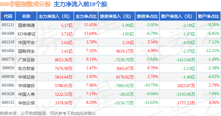 资金流向方面,800非银(399966)指数成份股当日主力资金净流入合计15.9亿元,游资资金净流出合计4.09亿元,散户资金净流出合计11.8亿元。成份股资金流向详情见下表: