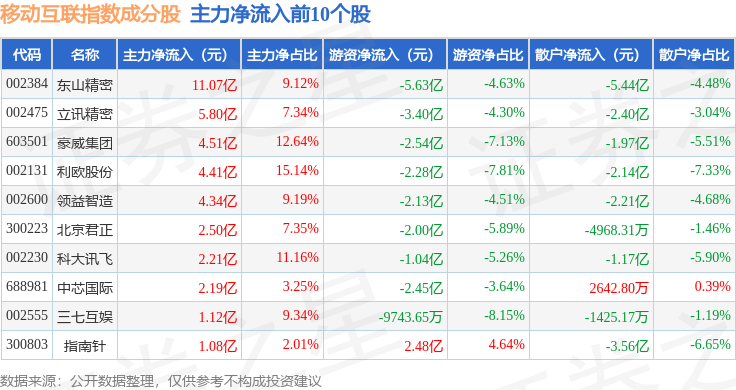 资金流向方面,移动互联(399970)指数成份股当日主力资金净流出合计11.5亿元,游资资金净流出合计14.17亿元,散户资金净流入合计25.68亿元。成份股资金流向详情见下表: