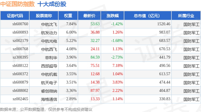 证券之星消息,12月12日,中证国防(399973)指数报收于1664.96点,涨1.35%,成交488.87亿元,换手率3.59%。当日该指数成份股中,上涨的有41家,西部材料以10.0%的涨幅领涨,下跌的有9家,七一二以2.75%的跌幅领跌。