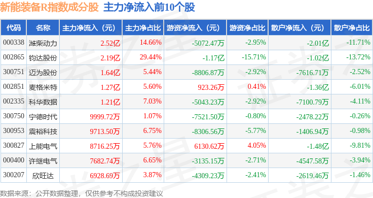 资金流向方面,新能装备R(470043)指数成份股当日主力资金净流出合计32.36亿元,游资资金净流出合计7675.08万元,散户资金净流入合计33.13亿元。成份股资金流向详情见下表: