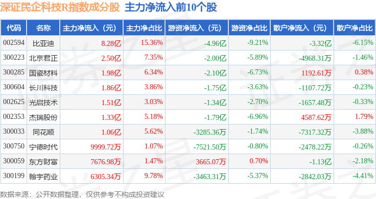 资金流向方面,深证民企科技R(470059)指数成份股当日主力资金净流出合计18.27亿元,游资资金净流出合计8.82亿元,散户资金净流入合计27.09亿元。成份股资金流向详情见下表: