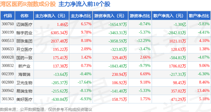 资金流向方面,湾区医药R(480013)指数成份股当日主力资金净流入合计3725.82万元,游资资金净流入合计2084.44万元,散户资金净流出合计5810.26万元。成份股资金流向详情见下表: