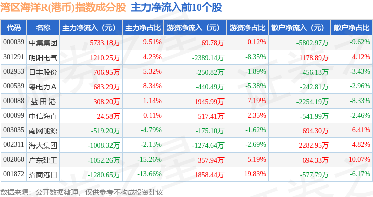 资金流向方面,湾区海洋R(港币)(480020)指数成份股当日主力资金净流出合计5724.95万元,游资资金净流出合计1699.85万元,散户资金净流入合计7424.8万元。成份股资金流向详情见下表: