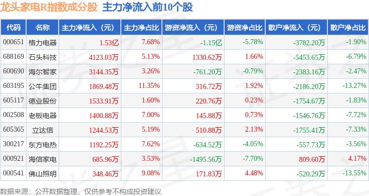 资金流向方面,龙头家电R(480028)指数成份股当日主力资金净流出合计1.11亿元,游资资金净流出合计1.65亿元,散户资金净流入合计2.75亿元。成份股资金流向详情见下表: