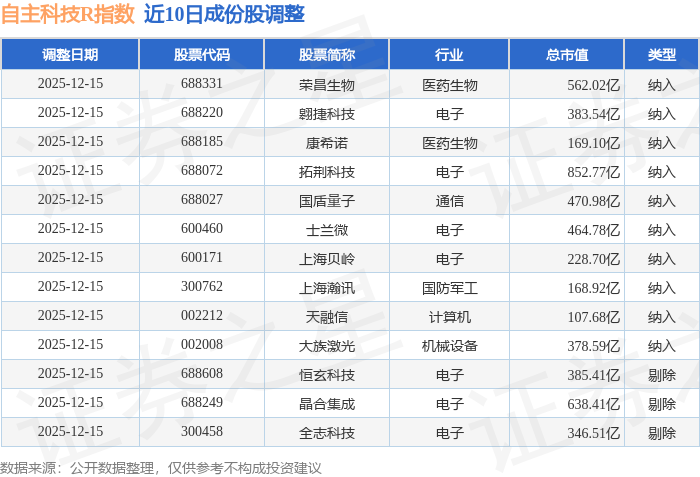 近10日内自主科技R(480033)指数成份股做了调整,新纳入了10只股票,剔除了3只股票。