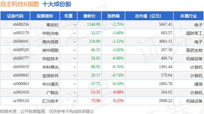 自主科技R(480033)指数十大成份股详情如下: