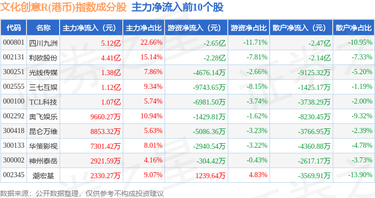 资金流向方面,文化创意R(港币)(480047)指数成份股当日主力资金净流入合计3478.02万元,游资资金净流出合计9.57亿元,散户资金净流入合计9.22亿元。成份股资金流向详情见下表: