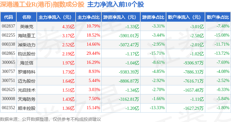 资金流向方面,深港通工业R(港币)(483018)指数成份股当日主力资金净流出合计20.2亿元,游资资金净流出合计20.11亿元,散户资金净流入合计40.3亿元。成份股资金流向详情见下表: