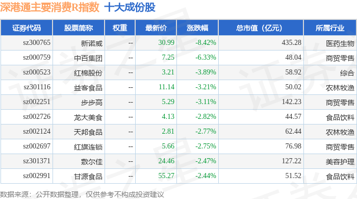 证券之星消息,12月12日,深港通主要消费R(483021)指数报收于6806.06点,涨0.6%,成交324.4亿元,换手率1.33%。当日该指数成份股中,上涨的有67家,康耐特光学-一百以10.0%的涨幅领涨,下跌的有51家,新诺威以8.42%的跌幅领跌。