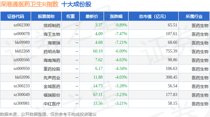 深港通医药卫生R(483023)指数十大成份股详情如下: