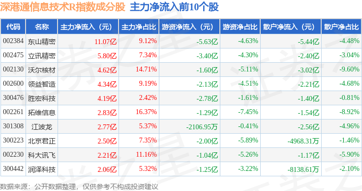 资金流向方面,深港通信息技术R(483027)指数成份股当日主力资金净流出合计5.92亿元,游资资金净流出合计31.07亿元,散户资金净流入合计36.99亿元。成份股资金流向详情见下表: