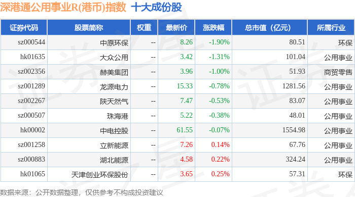 深港通公用事业R(港币)(483032)指数十大成份股详情如下: