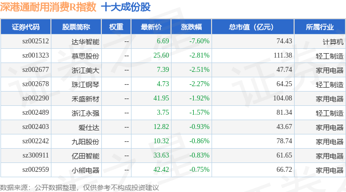 深港通耐用消费R(483049)指数十大成份股详情如下: