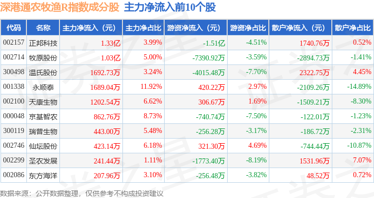 资金流向方面,深港通农牧渔R(483051)指数成份股当日主力资金净流入合计1.38亿元,游资资金净流出合计2.69亿元,散户资金净流入合计1.32亿元。成份股资金流向详情见下表: