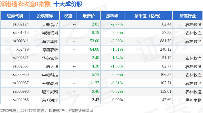 深港通农牧渔R(483051)指数十大成份股详情如下: