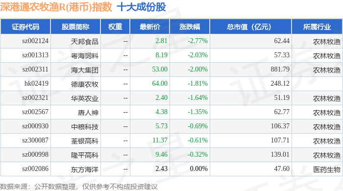 深港通农牧渔R(港币)(483052)指数十大成份股详情如下: