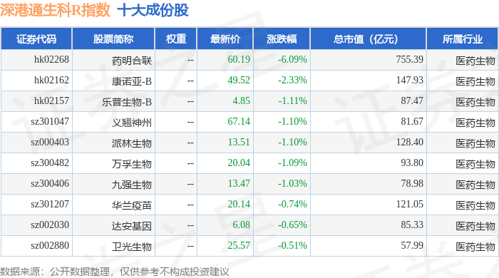 证券之星消息,12月12日,深港通生科R(483059)指数报收于7665.92点,涨1.09%,成交141.74亿元,换手率1.02%。当日该指数成份股中,上涨的有37家,昭衍新药以19.75%的涨幅领涨,下跌的有19家,药明合联以6.09%的跌幅领跌。