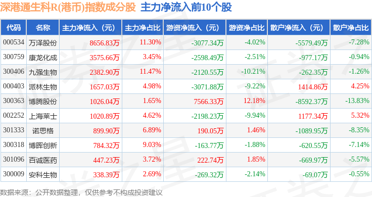资金流向方面,深港通生科R(港币)(483060)指数成份股当日主力资金净流出合计2406.18万元,游资资金净流出合计1.3亿元,散户资金净流入合计1.54亿元。成份股资金流向详情见下表: