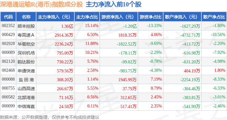 资金流向方面,深港通运输R(港币)(483078)指数成份股当日主力资金净流入合计3.94万元,游资资金净流出合计5046.32万元,散户资金净流入合计5042.38万元。成份股资金流向详情见下表: