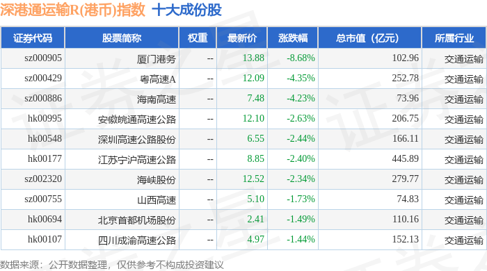 深港通运输R(港币)(483078)指数十大成份股详情如下: